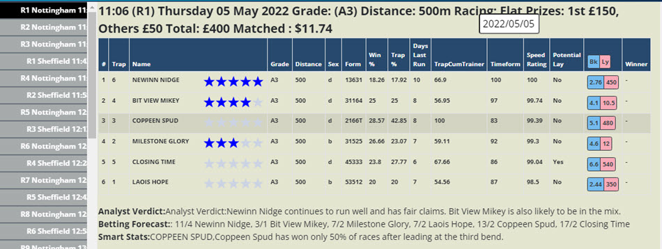 And if you don’t have access to quality ratings, you can’t really win on Greyhound long term. Getting access to the quality information is the key to access for Greyhound betting.